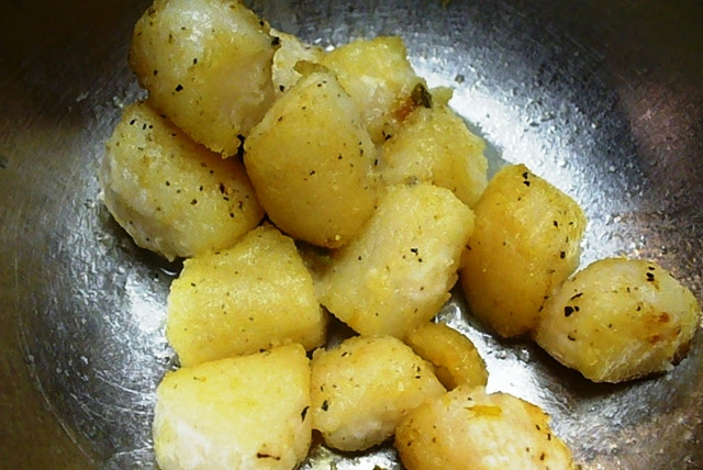 We had a bit of sauteed Kielbasa left over from the previous night's dinner, which had come from Mazullo's Market in Aurora. And, despising all forms of processed shrimp, I took a chance on some frozen bay scallops from Giant Eagle in Solon, after the fish counter lady, of her own initiative, showed me the box they came in that said "dry" (she had no idea what "dip" or "wet pack" or "dry pack" meant; it was my question about this that prompted her to offer to fetch the box - thank you!). And I have to say - they weren't the best scallops I ever ate, but they didn't smell or taste of chemicals, either.